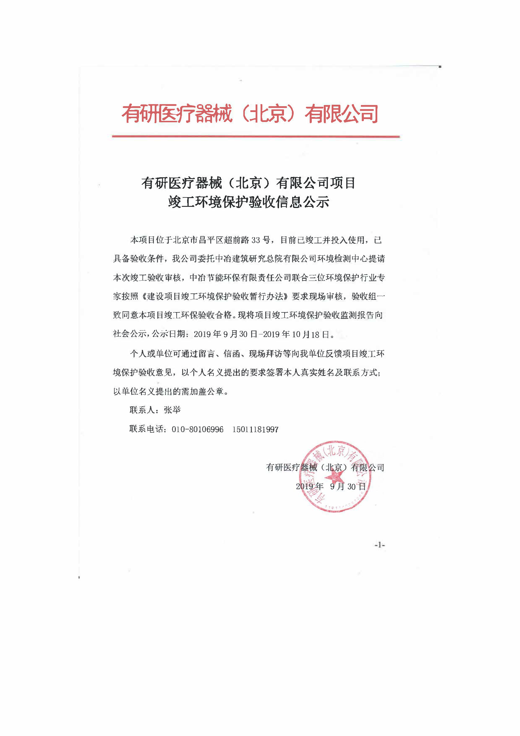 【公示】有研醫(yī)療器械(北京)有限公司項(xiàng)目竣工環(huán)境保護(hù)驗(yàn)收信息公示